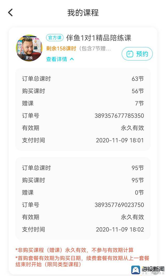 据于小姐先容,2020年11月,她为孩子续购了伴鱼少儿英语的两期外教一对一课程,单期价值9280元,续费共花费18,560元,她已累计采办4期课程。“孩子上高中落后修压力大,假期还要竣工学校功课,基础没功夫上课。”于小姐示意,伴鱼少儿英语的课程针对6岁至12岁儿童,偏重分级绘本阅读,孩子升入高中后,不单功夫重要,新采办的课程实质也已不再适配,故自2022年起停顿上课,此中一期课程仅上了几节,另一期则齐备未开课。